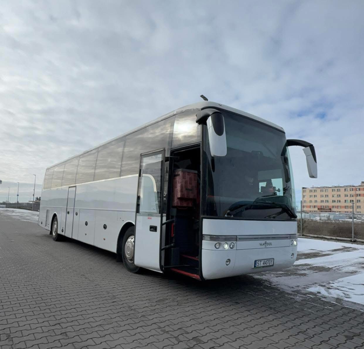 Autobus VanHool T915 to przestronny pojazd dla 51 pasażerów, pilota i kierowcy, idealny do długich podróży. Wyposażony w klimatyzację oraz indywidualne nawiewy i oświetlenie, zapewnia komfort na najwyższym poziomie. Fotele z podłokietnikami, rozkładane oraz z pasami bezpieczeństwa gwarantują wygodę i bezpieczeństwo. Dodatkowo, autobus wyposażony jest w mikrofon, DVD, lodówkę oraz ogrzewanie postojowe, co zwiększa komfort podróży. Stoliczki i siateczki na oparciach foteli pozwalają na wygodne przechowywanie drobnych przedmiotów. VanHool T915 to doskonały wybór na wycieczki, wyjazdy integracyjne, konferencje oraz imprezy okolicznościowe, zapewniając niezapomniane wrażenia z podróży.